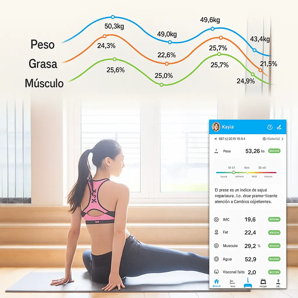 Conexión con App: Te indica índice muscular, tejido adiposo, índice de agua, índice de hidratación, grasa corporal, masa ósea, calorías sugeridas y más.