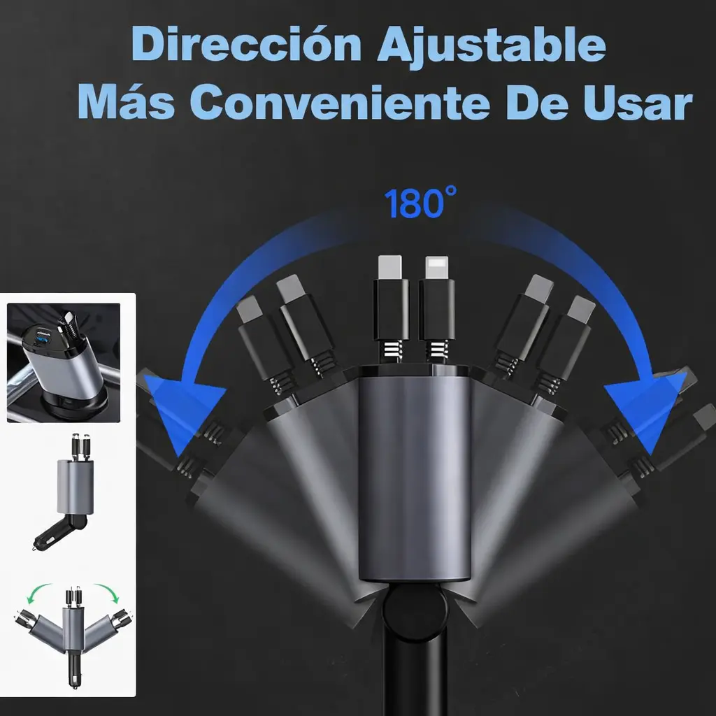 Este cable de carga ajustable de 180° es perfecto para el uso en el auto, ya que permite cargar tu celular sin que el cable se doble ni estorbe mientras manejás. Su diseño con ángulo regulable mantiene el conector firme y protegido, ideal para soportes de tablero o rejilla de ventilación. Brinda una carga estable y segura, evitando el desgaste común de los cables tradicionales durante el uso diario en el vehículo.
