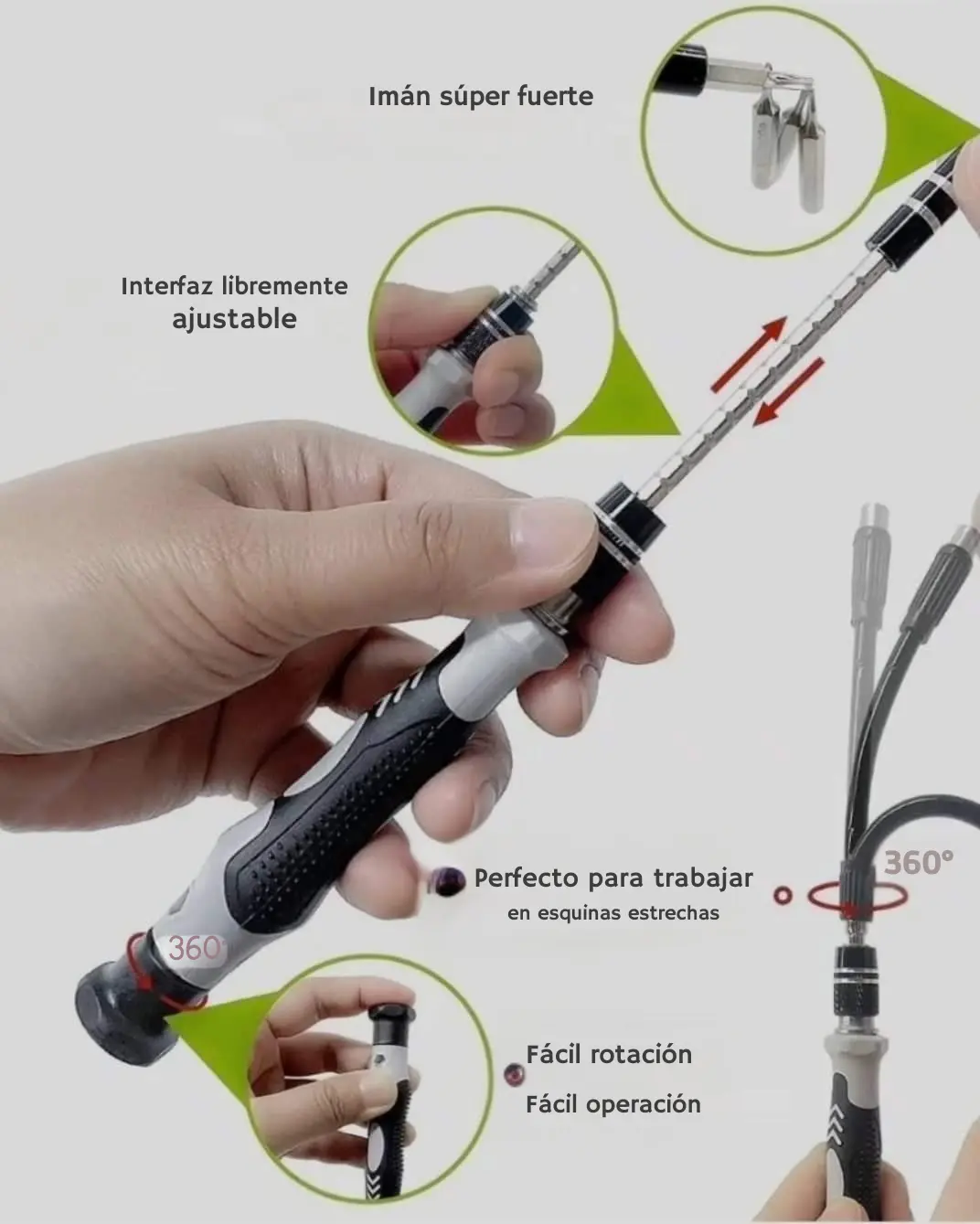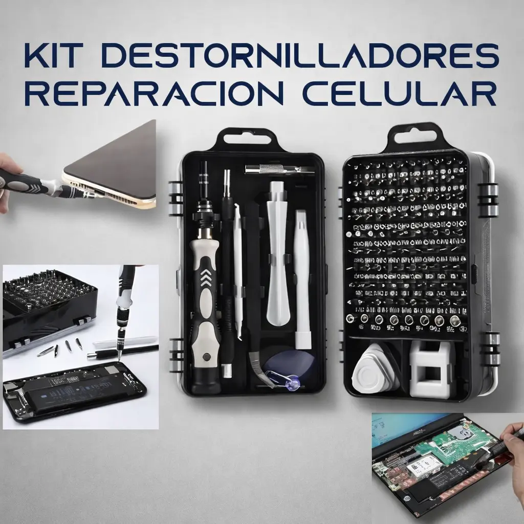 Este kit de destornilladores de precisión es la herramienta ideal para reparación de celulares, laptops, tablets, computadoras, consolas y pequeños dispositivos electrónicos. Incluye una amplia variedad de puntas, herramientas auxiliares y mango ergonómico para trabajos delicados y precisos.
