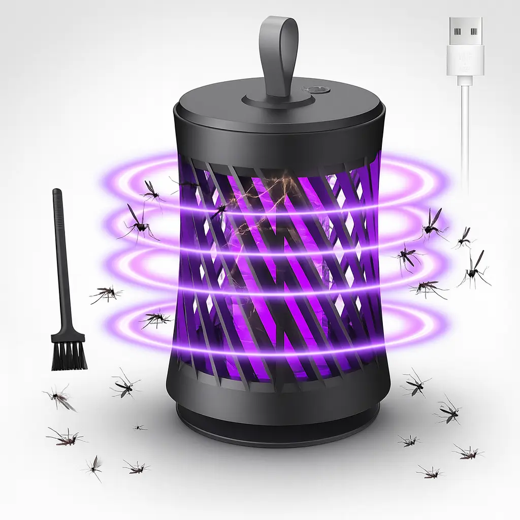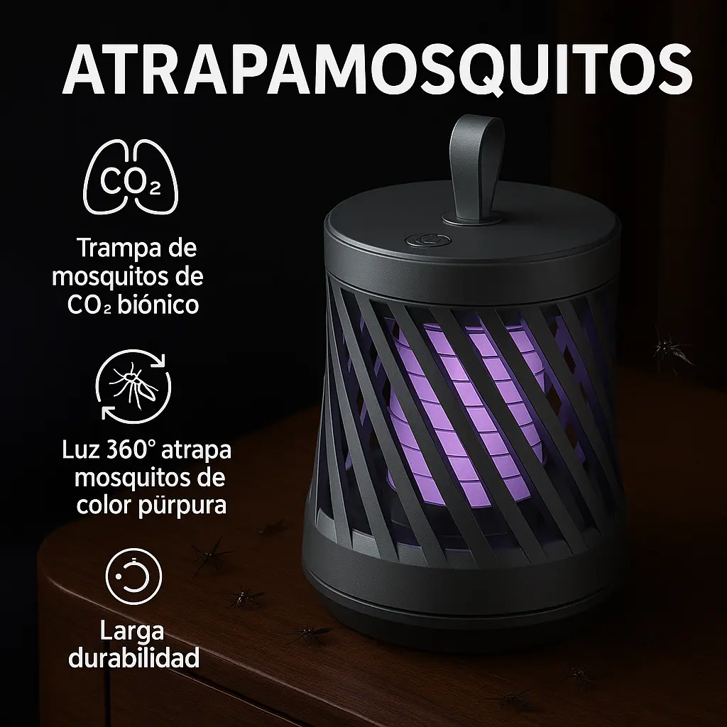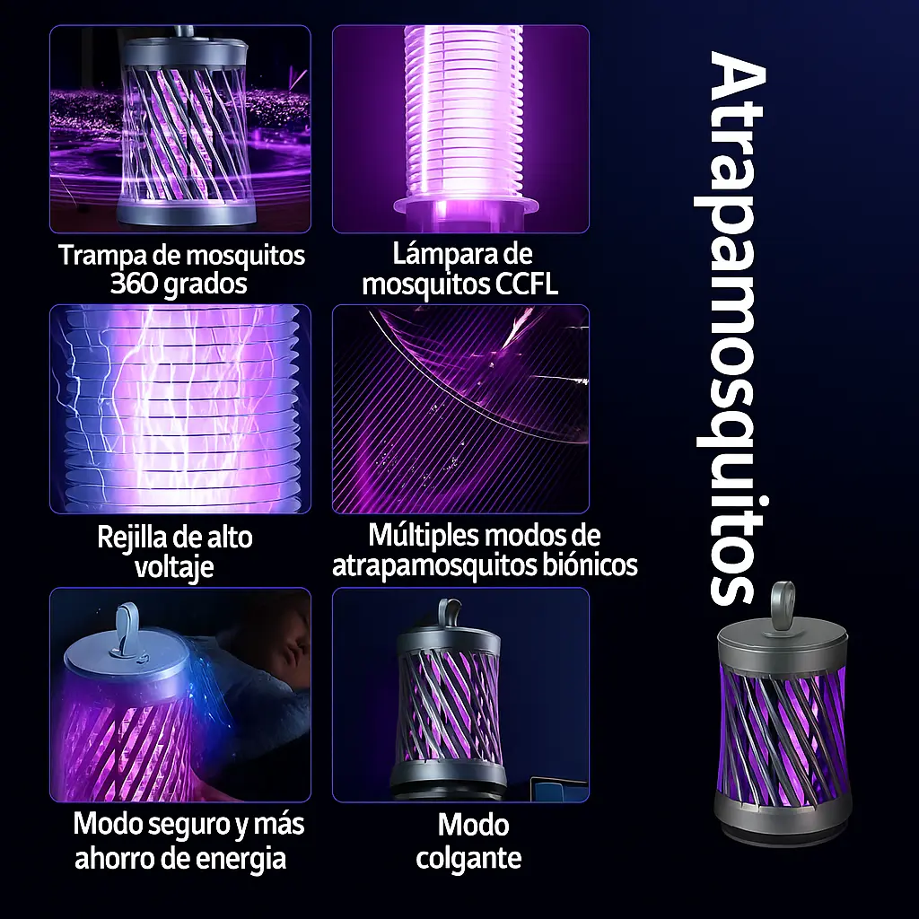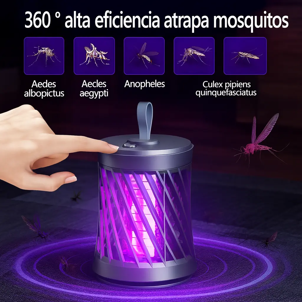 Olvídate de los mosquitos con este Atrapamosquitos 360°, equipado con luz púrpura CCFL y rejilla de alto voltaje. Silencioso, de bajo consumo y con modo colgante o de escritorio, ideal para mantener tu hogar libre de insectos toda la noche.