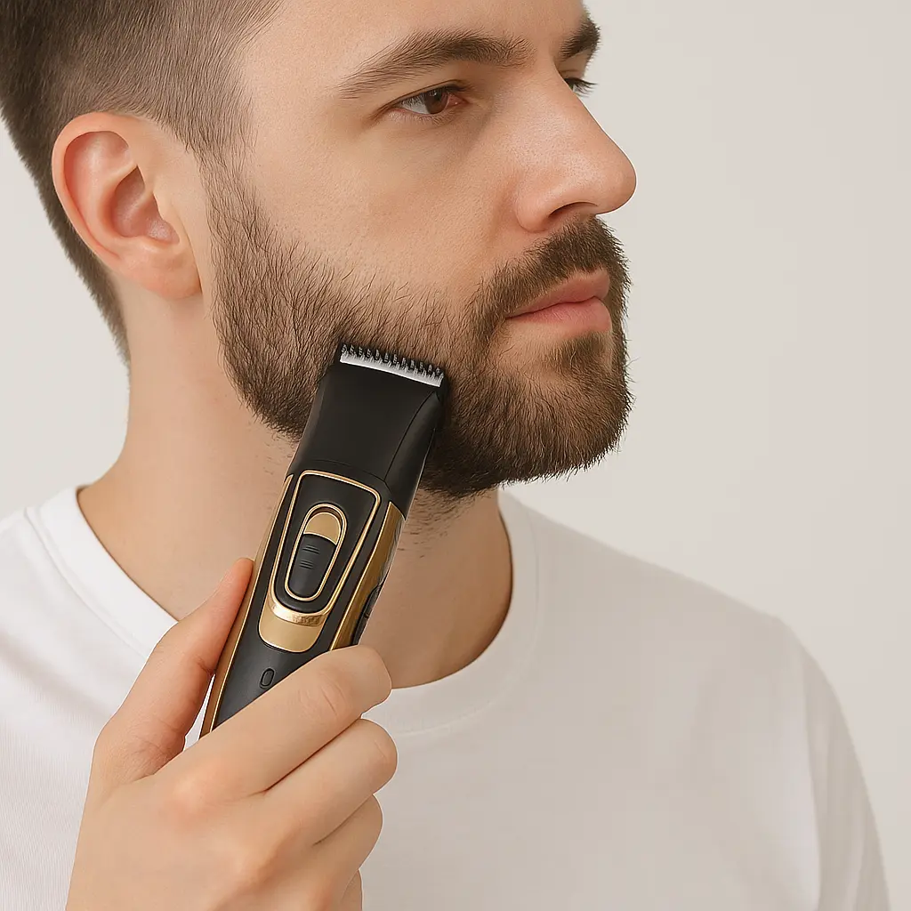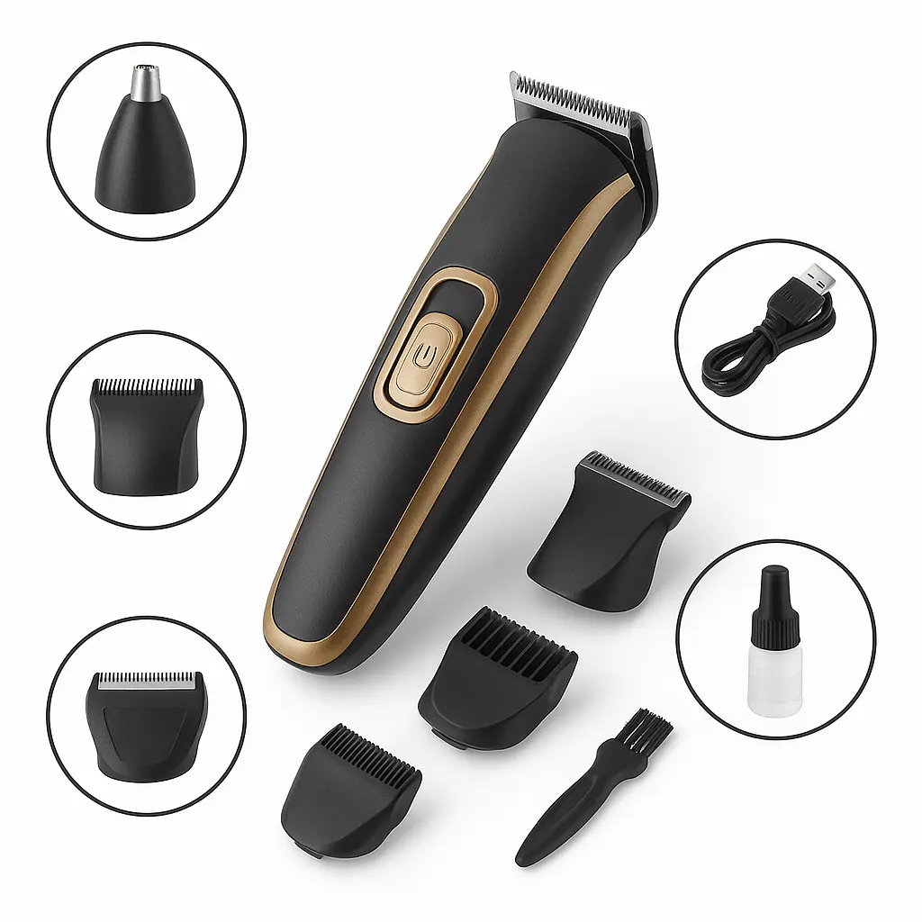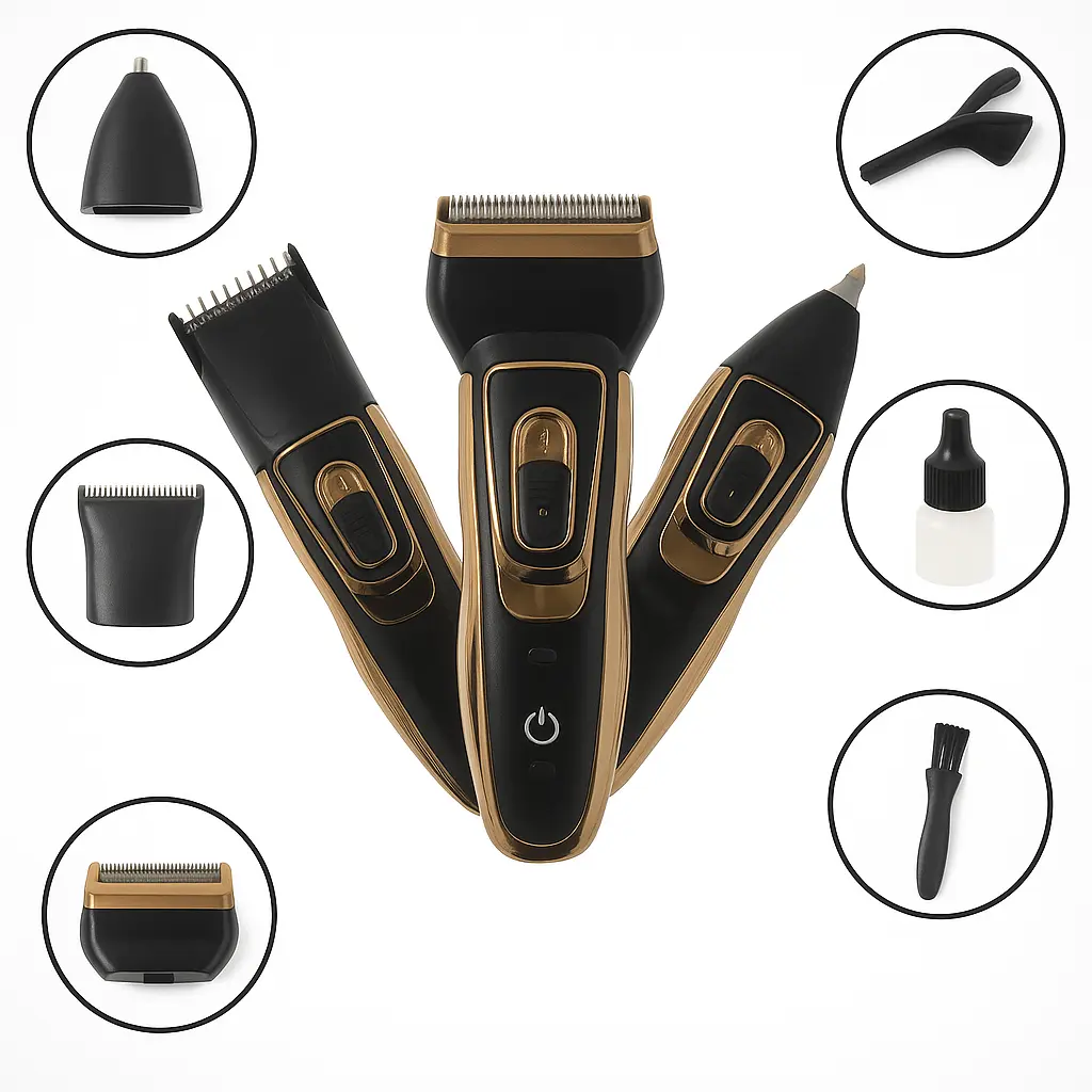 Domina tu look desde casa con set multifuncion. Diseñado con acabado negro y dorado premium, ofrece potencia, precisión y elegancia en un solo equipo. Ideal para barba, cabello, nariz y cuerpo, con cuchillas de acero inoxidable que garantizan un afeitado suave y sin irritación.